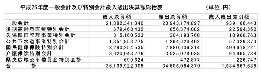 平成26年度の一般会計決算は、見出しの歳入・歳出額差引額9億3千9百万円になりました。次年度への繰り越し財源を差し引き8億8千7百万円が実質収支額(決算剰余金)となり、前年度比7千9百万増円となりました。