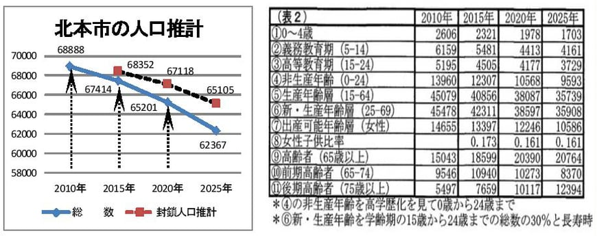 この差は社会減といい、まさに社会経済の変化要因を分析し、政策で克服することが重要となります。そういう意味で北本市は、人口動態を的確に分析・予測し、「消滅可能性都市」から持続可能性都市へと転換できるか。北本市は「岐路」に立っていると認識しています。