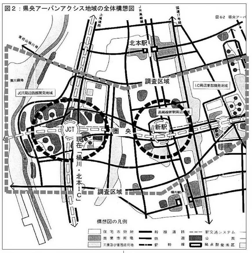 圏央道の開通は遅れ、上尾道は桶川まで、高速は中断という国の方針転換や社会経済の激変(バブルの崩壊等)もあり、この計画は市政の中心政策からは忘れられ、結果は絵に書いた幻で終わっています。